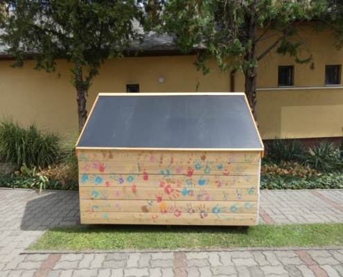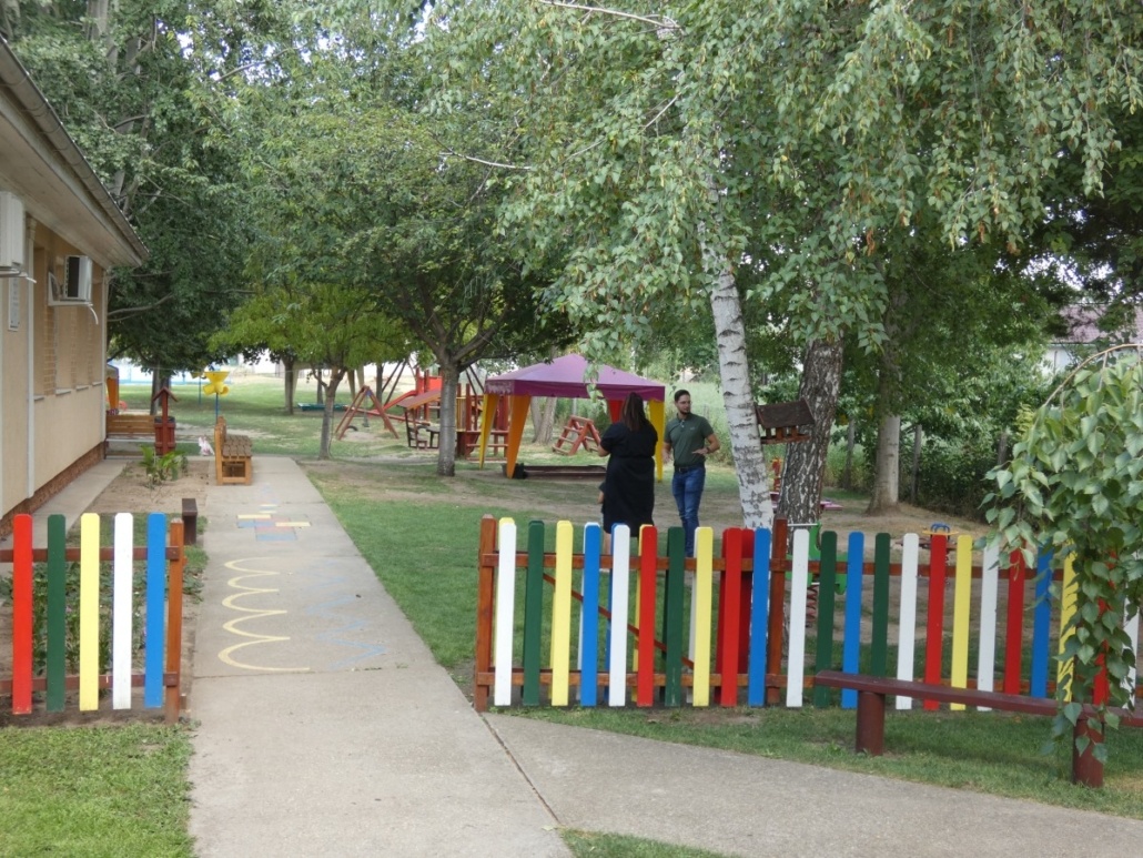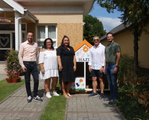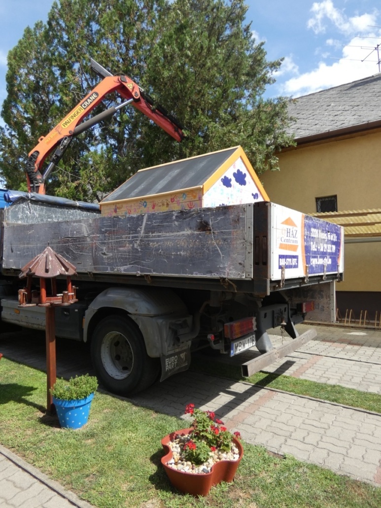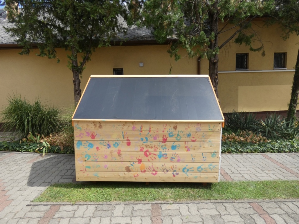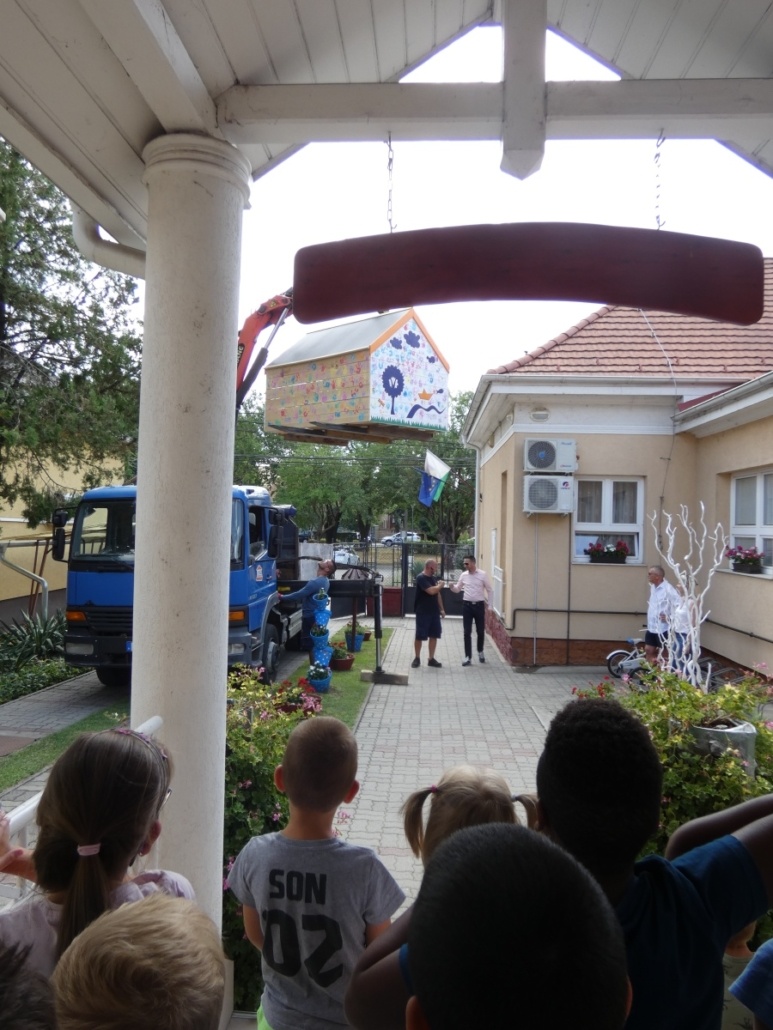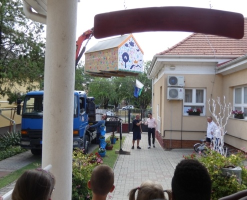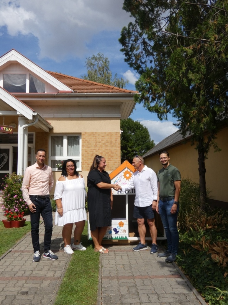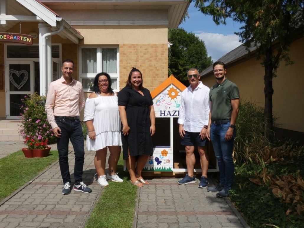 Júliusban a Mesefesztiválon tett látogatásunk során a gyermekek és a kísérő felnőttek is egyaránt megcsodálták a Bau-Styl Kft által felállított frappáns házikót, mely több funkciót szolgál a gyermekek számára. Mivel a Bau-Styl Kft tulajdonosának mindhárom gyermeke a mi óvodánkba járt, illetve a tavalyi évben is megajándékozták az egyik csoportunkat egy falra rögzített, hatalmas rajztáblával, így arra gondoltunk, hogy megérdeklődjük, hogy mi lesz a házikó sorsa a Mesefesztivál rendezvény után. Megkeresésünket jószívvel és pozitív hozzáállással vették, és a cég lelkes kapcsolattartója által leszerveztük a házikó átadását, amely 2022. augusztus 12-én, pénteken került megrendezésre. Nagy öröm volt számunkra, hogy a Házikó átadásán megjelentek a tulajdonosok is, akik több éve nem jártak az intézményünkben, így alkalmunk volt körbe vezetni őket és bemutatni az egyre szépülő óvodánkat. A beszélgetésünk során felajánlották továbbra is a segítségüket és a támogatásukat, melyért végtelen hálásak vagyunk.