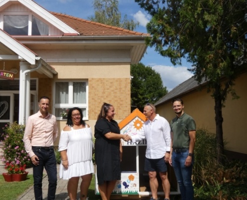 A Bau-Styl Házikó új otthonra talált. A Vecsési Falusi Nemzetiségi Óvoda gyerkőcei izgatottan vették birtokukba a színes házikót. A Bau-Styl képviseletében Dobos József és Dobos Gábor tulajdonosok, valamint Cseh Gábor operatív vezető is részt vettek az eseményen. A Dobos család tagjai nem először jártak az intézményben, hiszen Dobos József mindhárom gyermeke ebbe az óvodába járt. Gábor Dorottya német nemzetiségi óvodapedagógus és Eszényiné Honti Krisztina az intézmény vezetőhelyettese örömmel vezette körbe a résztvevőket az egyre szépülő óvodában.
