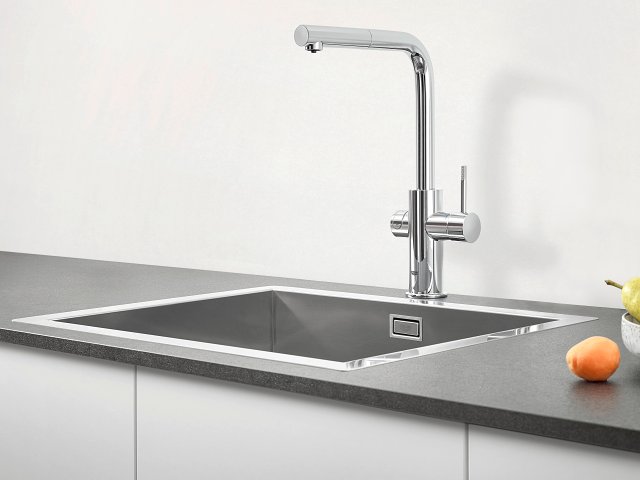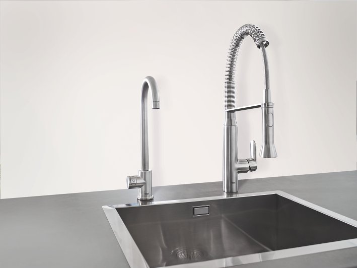 Mondjon búcsút a pazarló palackozott víznek és az ezzel járó logisztikai problémáknak. A GROHE Blue Professional kiváló ízű friss, szűrt vizet biztosít az irodája konyhai csapjából. Nem is lehetne könnyebb átalakítani munkahelyét palackmentes zónává. A csap szétválasztott belső vízvezetékekkel rendelkezik szűrhetetlen csaphoz és szűrt ivóvízhez és 150°-kal forgatható. A Push gomb megnyomásával csendes, szénsavas és közepesen szénsavas víz állítható elő. A hűtő beépített kijelzővel és WLAN csatlakozással rendelkezik, hűtött, szénsavas víz előállításához. Nagy teljesítményű szűrő választható 4 különböző kapacitással. A flexibilis zuhany csapfej megkönnyíti a mosogató tisztítását és a nagyobb kannák feltöltését.